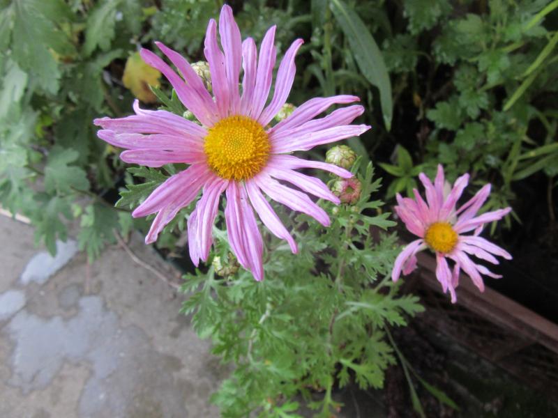 Die neue Saison fängt hier gleich mit einer Frage an: ist das wirklich `Clara Curtis´? Hatte die irgendwie heller in Erinnerung, kann mich als ziemlicher Chrysanthemenneuling natürlich auch täuschen. Das Pflänzle steht, wie einige andere auch, seit März hier im Topf rum und ist deswegen etwas verhärmt, bin einfach nicht zum Auspflanzen gekommen...