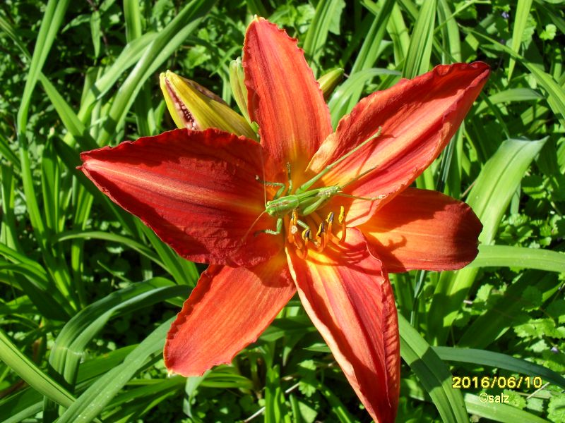 Taglilie Feuerwerk n. r. (oder Ruddy Giant) Der Grashüpfer steckte kopfüber in der Blüte als ich ihn entdeckte.Ansonsten blühen Bitsy, Sweet Pea (ein echtes Schätzchen) und eine auffallend Tiefburgunderrote mit scharzem Auge (Foto und Name hoffentlich demnächst)