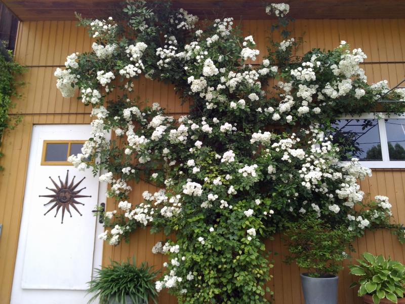 Für Alva - hier leider ein schlechtes Foto von meiner Alba maxima. Unten ganz schmal, nach oben bogig überhängend. Sie fängt gerade erst an mit blühen.Nach der Blüte oder im Frühjahr schneide ich dann zurück so wie ich es brauche.