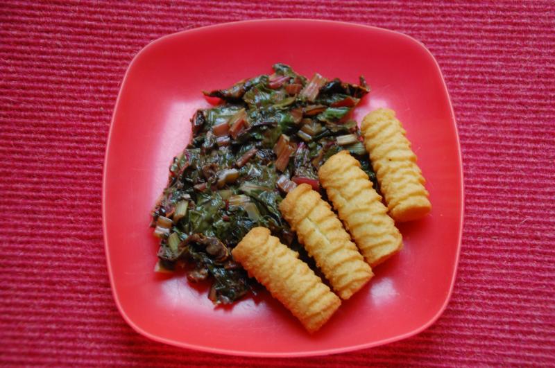 Kartoffelkroketten mit Mangold (Mangold, getrocknete Tomaten, Knoblauch, wenig Zwiebel, Sahne)aus welchen Gründen auch immer etwas unscharf