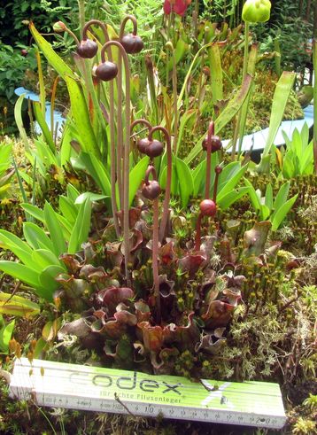 Heute habe ich mal den Zwergklon der Sarracenia purpurea der bei meinem Nachbarn im Moorbeet steht fotografiert. Mein Ableger davon ist heute zerlegt worden. Der hat etwas unter Schnecken gelitten und er bekommt jetzt einen anderen Platz.Ein paar Ableger habe ich auch noch getopft.Jetzt mal die Mutterpflanze die etwa 10 Jahre so steht, nur zwei Ableger wurden davon mal abgebrochen, sie blüht heuer reichlich.Zum Größenvergleich ein normaler Zollstock