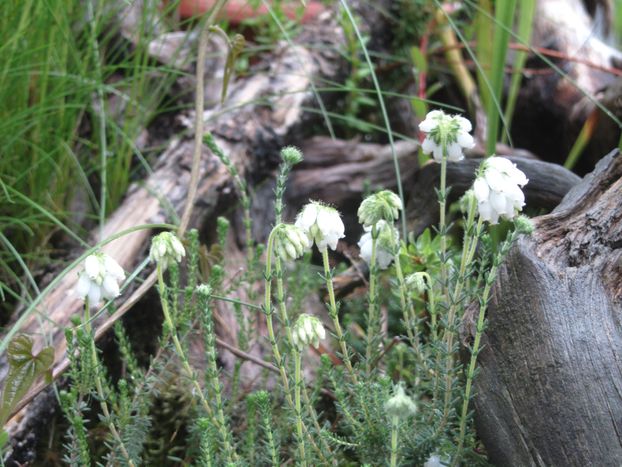 Im gleichen Kübel blüht eine Glockenheide Erica tetralix. Ich hatte die Erlaubnis das einzige weiße Exemplar aus dem Moorbeet des Nachbarn retten wo diese Mutante auftauchte. Da wird die Glockenheide mittlerweile erbarmungslos bekämpft.Ich habe schon im letzten Jahr von dieser Pflanze Samen abgenommen und die keimten in Massen. Davon kann ich gerne was abgeben, da es für meine Zwecke ganz sicher zuviele sind. Inwieweit die aber weiß blühen kann ich nicht sagen. Wenn man zwei oder drei hat wird aber bei den Nachkommen sicher wieder was weißes dabei sein.Die vom Komposthaufen gerettete Moorgränke hat sich auch entschlossen nicht zu sterben. Davon kann ich aber noch nichts abgeben. Die wollte sich schon vorher nicht vermehren bevor sie ausgerupft wurde.Leider liefert Google da keine lateinischer Bezeichnung. Wird auch immer schlechter diese Suchmaschine.