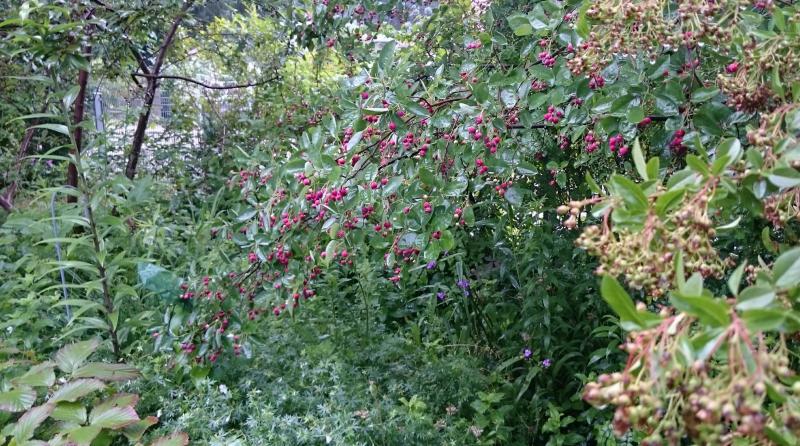 Rosen gibt es schon. Teilweise stecken die in den anderen Geölzen fest und orientieren sich nach außen. 'Immensee' blüht noch nicht.
