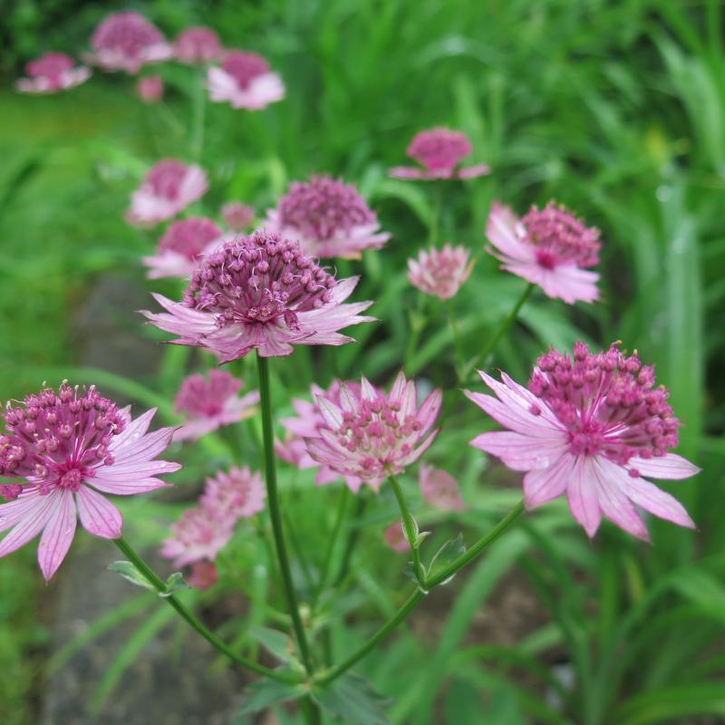 Was hier in diesem ganzen "Elend" gerade sehr gut blüht (bis jetzt 3 x Hagel...) sind die Astrantien.Weder die Blätter noch die, zugegebenermaßen kleinen und damit weder für Hagelkörner noch als Regenspeicher interessanten, Blüten hat es bisher getroffen.Astrantia "Roma" ist die auf dem Foto.
