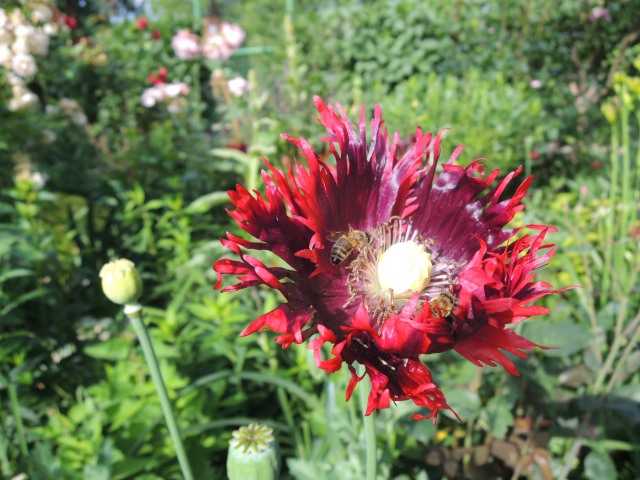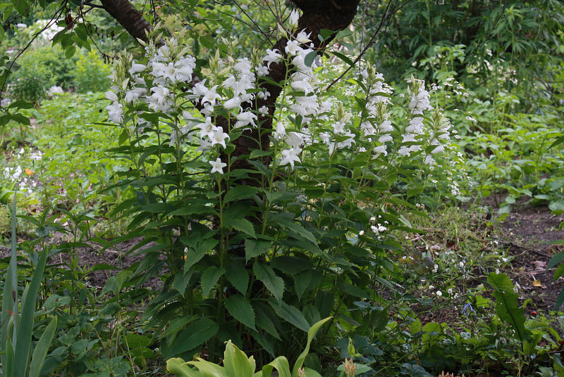 Ja, so langsam wird das was. Die Rose hatte ich als Steckling gezogen und diese Clematis ist endlich einmal unverwüstlich und blüht zuverlässig.Campanula latifolia 'Macrantha Alba' hat wie immer dicke schwarze Läuse, in diesem Jahr aber nicht an allen Stöcken. Dieser hier, im Schatten der Sauerkirsche, ist frei davon. (Heißt laut RHS C. latifolia var. macrantha 'Alba')