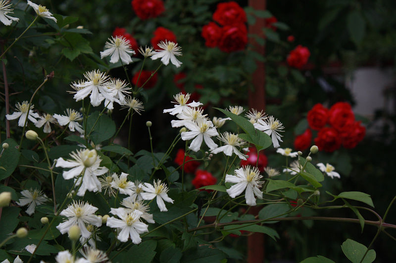 Hübsche Kombi!Clematis 'Paul Farges' und die Kletterrose ('Pauls Scarlet Climber'?) spielen Schneeweißchen und Rosenrot.