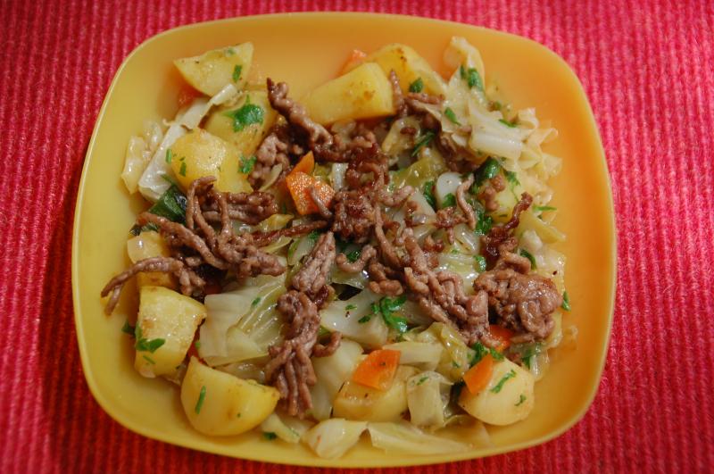 *Heute gab es Spitzkohlpfanne (Spitzkohl, Zwiebel, Möhre, Zwiebellauch, Kartoffel, Petersilie, Salz, Kümmel) mit Hackfleisch.