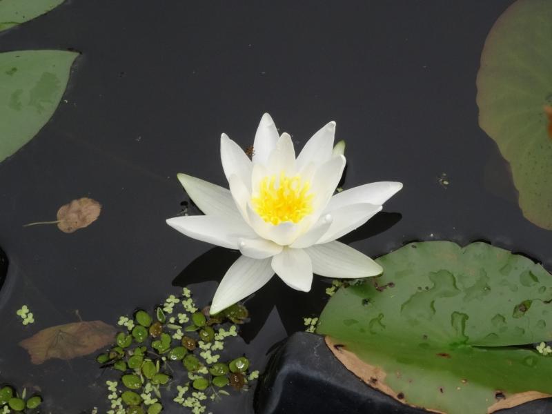 Der weniger schöne Teil: Man sieht nicht mehr, dass da überhaupt ein Teich ist.Der vom Vorbesitzer angelegte kleine Fertigteich ( geschätzte 2 qm) wurde von ihm mit einer viel zu stark wuchernden Seerose bepflanzt. Es gibt nur noch Blätter, die hoch über dem Wasser stehen. Vom Teich selbst sieht man aktuell nichts mehr. :-\Im nächsten Jahr wird das, zugegebenermaßen sehr schöne Seerosen-Monster durch ein schwachwüchsigeres Exemplar ersetzt.Sie hat allerdings immerhin den Vorteil, dass sie mit diesen Unmengen an Blattmasse im Verhältnis zur Größe des kleinen Teiches diesen sehr gut von durch Falllaub eingebrachten zu vielen Nährstoffen befreit. Teich, zugewuchert: