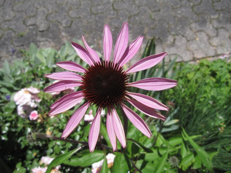 Passend am ersten Sommertag mit über 30 Grad überrascht mich heute neben der Garageneinfahrt: meine erste Echinacea für dieses Jahr. Eine namenlose (vermtl. schlicht E. purpurea?) aus geschenktem Saatgut mit 1,15 Metern Höhe.