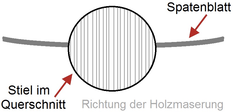 Fiskars-Spaten, Blatt und Stiel aus Metall und einem Guß, Stiel oval zur Belastungsrichtung ausgeformt, in meinem Betonlehm unkaputtbar seit über 10 Jahren, bei allen Spaten mit Holzgriff brach irgendwann, meist früher als später, der Stiel.