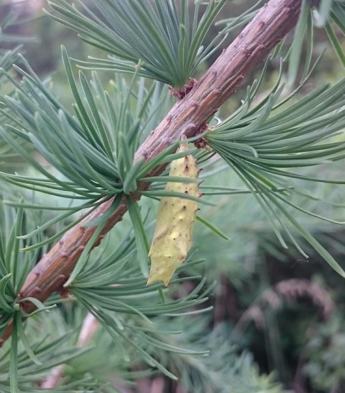 An meiner Larix kaempferi fand ich gestern diese Stürzpuppe. Die Larix war nicht die Futterpflanze. Was könnte das werden?