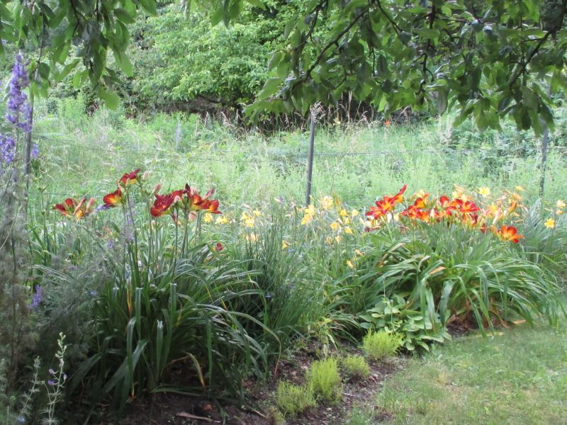 Die Hemerocallis sind dieses Jahr so richtig fett.Als ich vergangenen Herbst den daneben liegenden Teich gereinigt habe, habe ich den Schlamm auf das Beet gegeben. Außerdem hats ja ausreichend geregnet.Im Hintergrund übrigens das vernachlässigte Nachbargrundstück - Wildschweinland.Mein Sichtschutz aus Calamagrostis Karl Foerster funktioniert nicht.