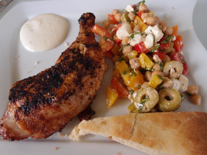 und gegesen haben wir gegrillte hähnchenschlegel mit schnellem fladenbrot und einem salat aus kichererbsen, schafskäse, paprika, grünen oliven, cocktailtomaten und petersilie
