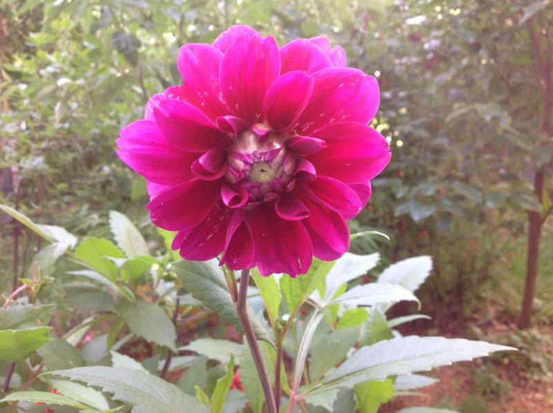 Die erste Dahlienblüte, heuer eher spät dran. Vermutlich 'Thomas Edison'
