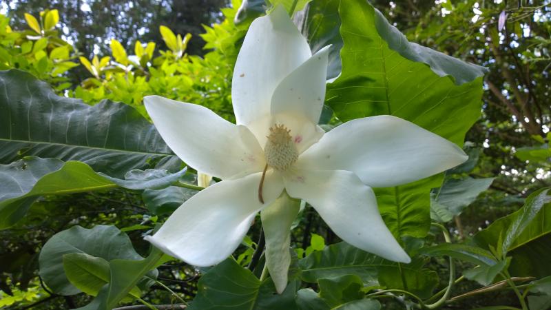 :DUnter den Magnoliensorten fällt mir 'Yellow Lantern' ein, eine gelb blühende Hybride mit relativ großen Blättern. Auch 'Tina Durio' hat vergleichsweise große Blätter. "Großblattmagnolien" sind das aber natürlich nicht.Hallo bristlecone,ich habe schon eine Asimina triloba (prima) und die Früchte reifen jedes Jahr ganz lecker aus. Mein Bäumchen misst 3 Meter und voriges Jahr waren es ca. 50 Früchte. Ganz so schlimm scheint mein Klima doch nicht zu sein :-)Grüße FlorianIn unserem mitteleuropäischen Klima, wo's bei knalliger Sonne, blauem Himmel, niedriger Luftfeuchtigkeit und eventuell auch noch Wind ganz schön trocken sein kann?Keine Großblattmagnolie, fürchte ich, wird das ohne Blattschäden aushalten. Darf ich einen Vorschlag machen: Pflanz eine Asimina triloba. Vorausgesetzt der Boden ist feucht, hält die auch vollsonnige Standorte aus. Ggf. als JUngpflanze schattieren.Große Blätter, interessante Blüten, sehenswerte Früchte (auch wenn die nicht reifen in deiner Ecke) und sehr schöne leuchtend gelbe Herbstfärbung.