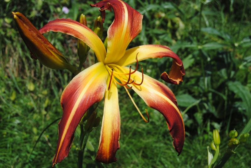 Hier reiche ich noch ein Foto nach von einer Blüte, die morgen blühen wird und heute schon an den Sepalen den für Taglilien ungewöhnlichen 'Zwirbelbart' entwickelt.Der Berleyer Zwirbelbart fängt an zu blühen. Er hat seinen Namen von den Sepalen, die sich bereits einen Tag, bevor die Blüte öffnet, zurückrollen und dann auch zurückgerollt beiben.