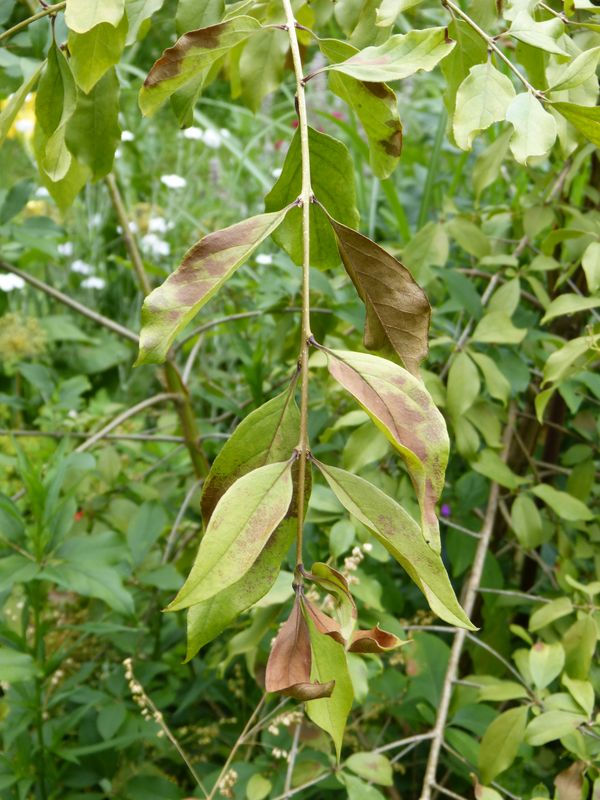 Eine ähnliche Symptomatik habe ich hier an einer Lonicera fragrantissima immer mal wieder.Bislang völlig unauffällige Triebe zeigen zunächst solche Blattverbräunungen, dann sterben die Blätter und der gesamte Triebe ab. Bei Lonicera fragrantissima kommen dann von der Basis neue gesunde Triebe.Interessanterweise sind auf ähnliche Weise auf schon zwei Thujen 'Smaragd' von Nachbars Hecke 1 m weiter längs erst eingetrocknet, dann abgestorben.Ich hab's bislang auf den schweren und verdichteten Boden geschoben, der zur Vernässung neigt. Was ja nicht heißt, dass genau dadurch nicht irgendwelche Phytophthora "zuschlagen".