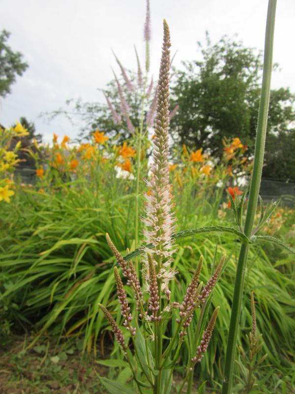 Veronicastrum virginicum 'Alboroseum' in Kombination mit Dipsacus fullonum: