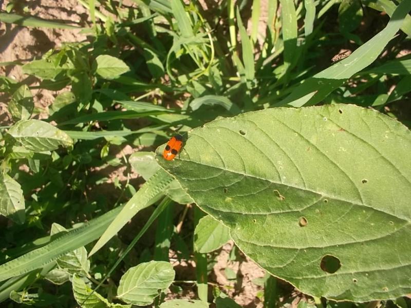 Der kleine orange Käfer mit den schwarzen Flecken ist ein Ameisen-Sackkäfer; die Larven haben eine interessante Entwicklung.