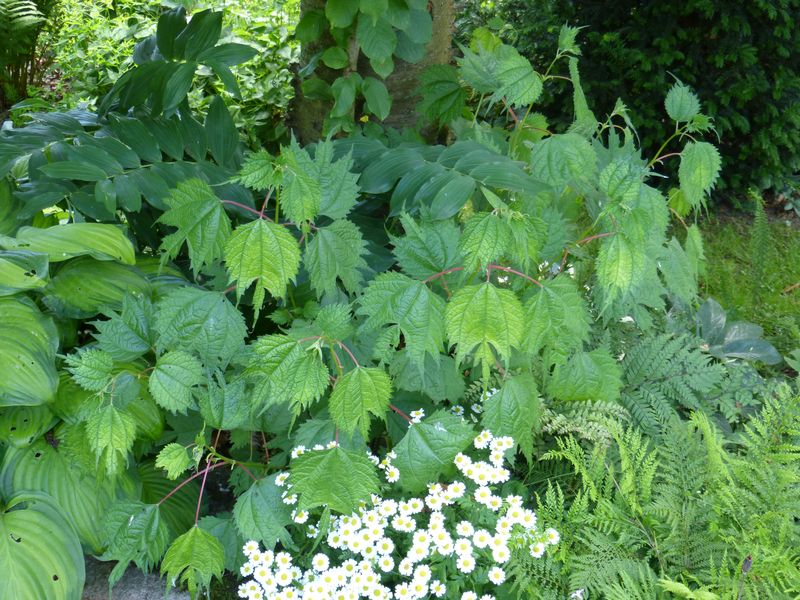 Ob die Samen ansetzt?Dieses Jahr steht Boehmeria triscupis richtig üppig da. Die 'Nichirin' ist hingegen gänzlich untergetaucht.