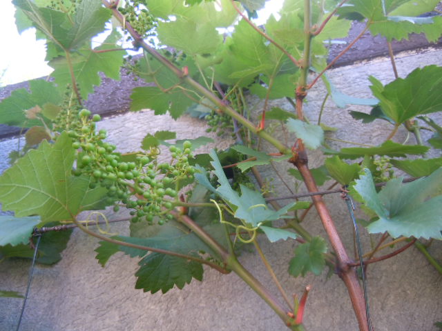 unser Kaiserstühler Weinstock (Sorte ?) hat dieses Jahr gut angesetzt. Die Trauben werden zwar nicht groß, aber wir wollten auch nur die Garagenwand begrünen und die Vögel sollten auch was haben. In manchen Jahren werden sie nicht reif, dann trocknen und verkochen wir die Trauben. Haben sie auch schon mal nur entsaftet und Gelee gekocht.