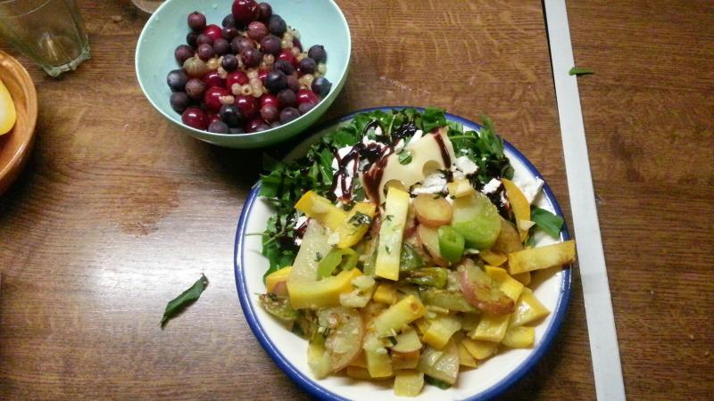 Und dann ward ihr erschrocken, dass es überhaupt nicht langweilig war, oder??Bei mir gab es das Essen auch beim Füßeball: Gemüsepfanne nach Art des Hauses: Kartoffel, Zuccini, grüne Tomate, Paprika, Kräuter - alles aus dem Garten. Dazu Sauerampfer mit Balsamicodressing und Schafskäse