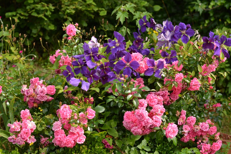 Die Feldsteinmauer ist ein schöner Kontrast zu deinen anderen Beeten. :DRose "Palmengarten Frankfurt" trägt Clematis Jackmanii: