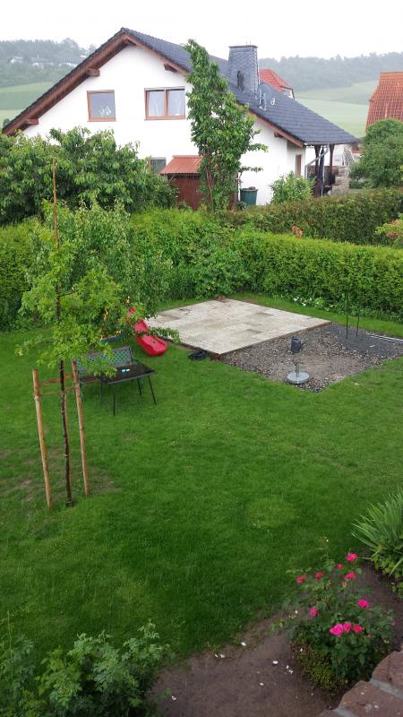 ) eine Schicht harten Bodens kommt, der beim Bau des Hauses durch die Baufahrzeuge verdichtet wurde, oft so sehr, dass man da mit dem Spaten kaum noch durchkommt. Sollte das so sein, müsstest du am besten den Boden an zahlreichen Stellen um den Wurzelbereich herum tief aufgraben/aufhacken, so tief, dass diese verdichtete Schicht durchbrochen wird und man wieder in normalen unverdichteten Unterboden kommt.Dann den aufgelockerten Boden mit Kies vermischt wieder einbringen. Auf diese Weise behebt man eventuelle Staunässe und schafft dem Baum außerdem die Möglichkeit, an diesen Stellen mit seinen Wurzeln ins tiefere Erdreich vorzudringen.