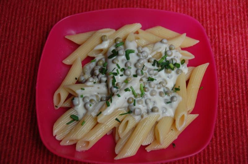...Hier gabs Nudeln mit Erbs-Sahne-Soße (Erbsen, Mehlschwitze, Sahne, Frischkäse, S&P; Schnittlauch).