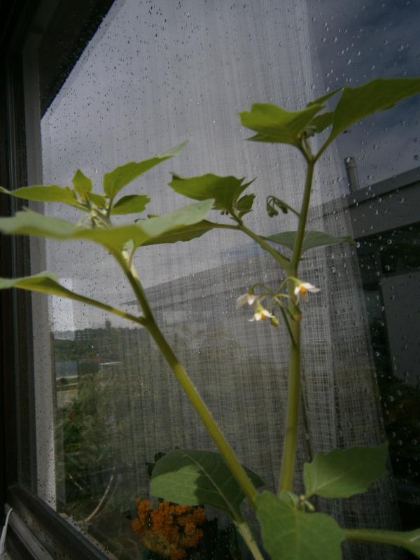 Ihr erinnert euch ...?Jetzt blüht die Pflanze und leider ist es keine Physalis sondern der Schwarze Nachtschatten... :(Wird leider nichts mit leckeren Früchten.Kennt jemand diese Pflanze?Die Blätter sind sehr weich und haarig, ein Nachtschattengewächs?Die Stiele und Blattränder sind behaart, die Stiele sind auberginefarben. Gekeimt ist die Pflanze in einem Topf mit einem Hibiskus.