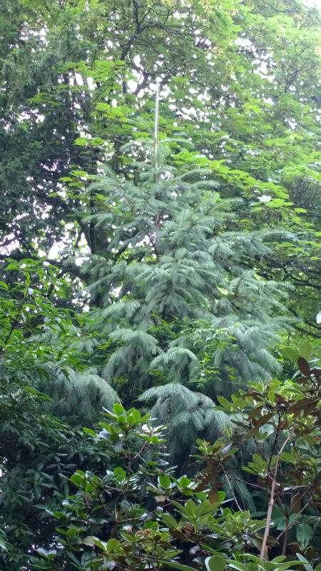 Picea retroflexa syn.gemmata bei mir am Hang aus einiger Entfernung(der untere Stamm ist verdeckt) . Rechts oben die Cedrus deodara.