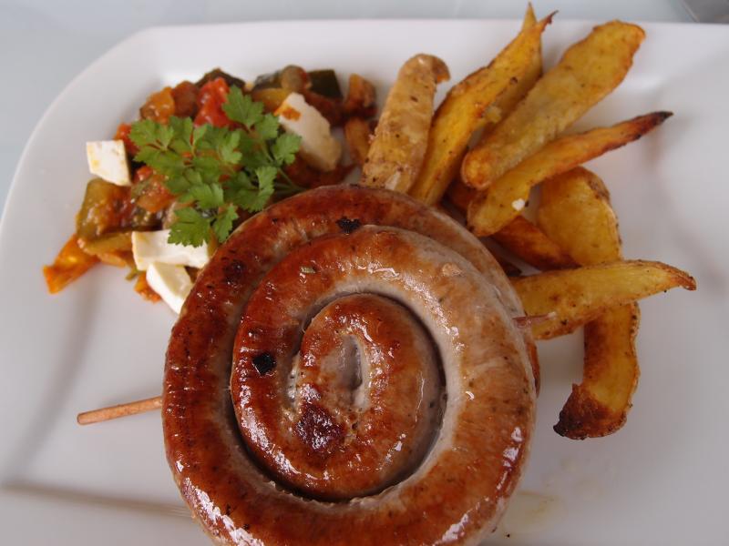 heute bratwurstschnecken mit ofenkartoffeln und zucchini-tomaten-schafskäsegemüse