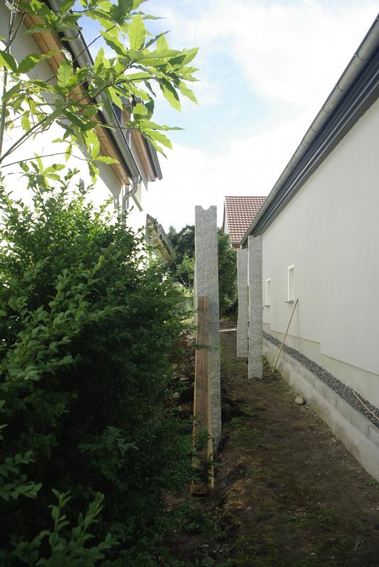 Endlich nach einer gefühlten Ewigkeit, hat unser Nachbar seine Hauswand zur Schlippe verputzt. Nun konnten wir die schon lang geplante Gestaltung in Angriff nehmen.Am Freitag ging es los und als erstes wurden die Granitstelen aufgerichtet. Davor hatten wir richtig Angst, ob wir die überhaupt von der Stelle bekommen.