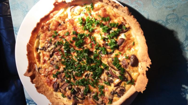 Bei dem Backhenderl würde ich auch nicht nein sagen ....Ich habe noch einen Nachtrag von letzter Woche:Tarte mit Chamignons, Ziegenfrischkäse, Eiersahne, Greyerzer und viel frischem Schnittlauch.