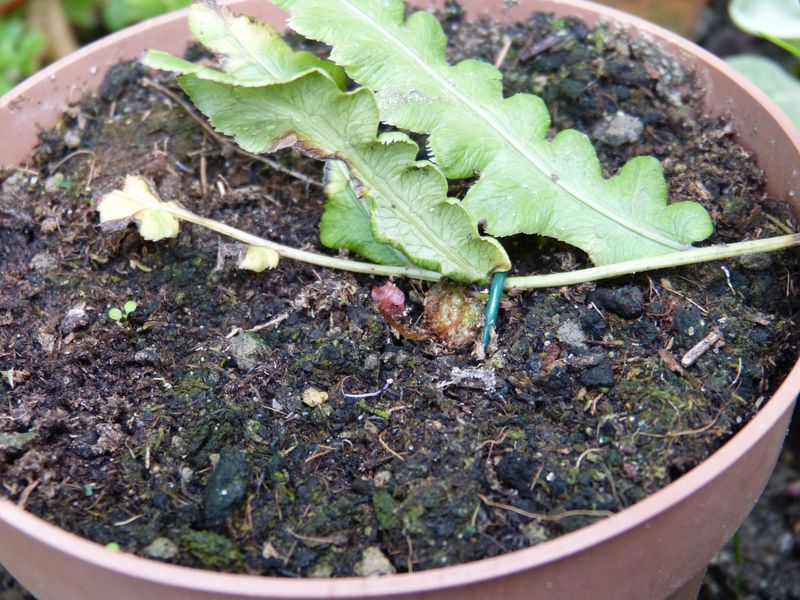 Meine Güte, der hat's eilig!Um das ganze zu vereinfachen, habe ich einen Topf mit Substrat ins Beet gestellt und den Wedel mit der Bulbe darauf fixiert.