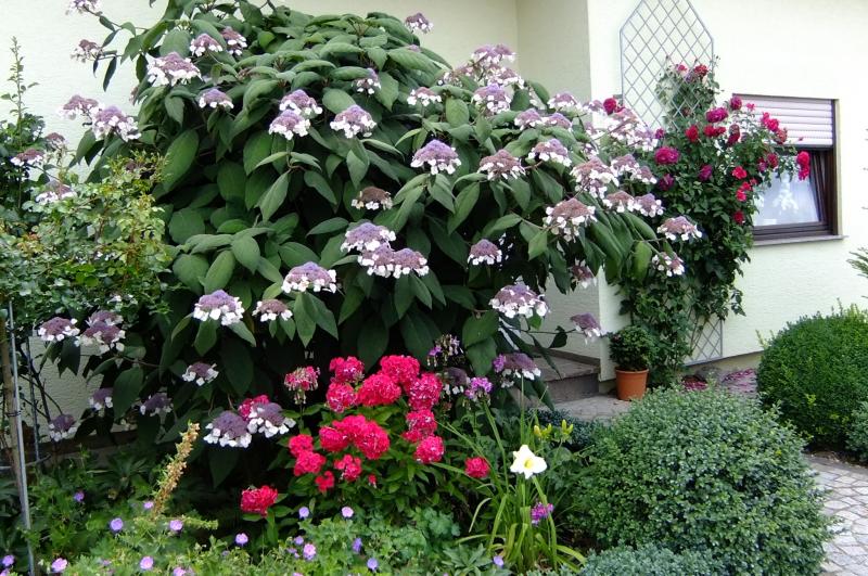 Hydr. aspera Macrophylla steht seit 1984 in meinem Vorgarten. Dieses Jahr ist sie aufgrund des vielen Regens im Frühjahr so stark gewachsen, daß ich die Haustür freischneiden mußte.