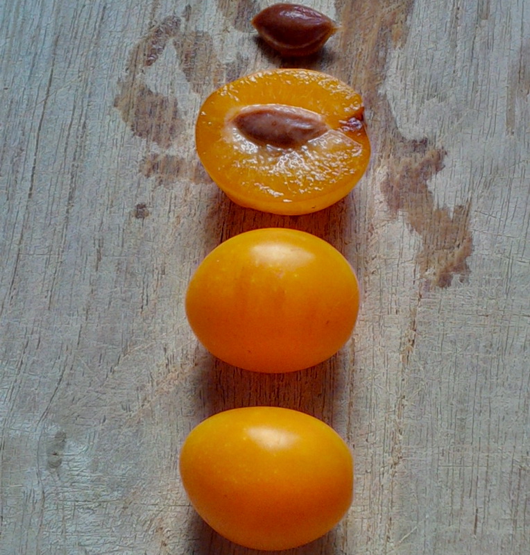 Danke für dein Bild Lizzy, damit konnte ich meinen Zufallsfund endlich zuordnen. Habe beim querfeldein Spaziergang nämlich keine 400m entfernt von meiner Wohnung genau diese Früchte am Baum hängend entdeckt und mich gefragt, was das sein könnte.Relativ langgestreckt, nicht abgeplattet sondern rundlich, zu schlank für eine Pflaume, aber wohl mit Pflaumenkern drin. Vor allem mit einer Farbe, die zwischen den grünen Blättern fast wie Leuchtreklame wirkte ;-) Nur deswegen hab ich die Früchte überhaupt bemerkt. Die dickste der unten gezeigten Früchte ist 3 cm hoch und in der Mitte etwa 2,5 cm dick.Einen Unterschied zu deinem Bild gibts: das was ich fand, hatte, trotz Richtung Sonne hängend, keine rotgefärbten Bäckchen. Ich würde das, was ich sah einheitlich hell-orange gefärbt nennen.Geschmacklich prima, aber das Wort Steinlöslichkeit ist def. das Gegenteil vom Istzustand bei meinem Fund ;-)Habe, nach dem hier gelesenen, etwas mit mir gerungen, ob ich wohl mal mit Spaten und größerem Blumentopf bewaffnet heimlich vorbei fahre, denn da standen, nur 2..2,5 m entfernt 2..3 Minibäumchen in der stark verwilderten Wiese, möglicherweise Wurzeltriebe, mit zumindest identischen Blättern... aber die schlechte Steinlöslichkeit, die dafür sorgte, das ich eher die ganze Haut drumrum weg bzw. abgeschoben habe, als den Kern ohne viel Fruchtfleisch dran heraus zu kriegen..hat mich dann doch ausgebremst.
