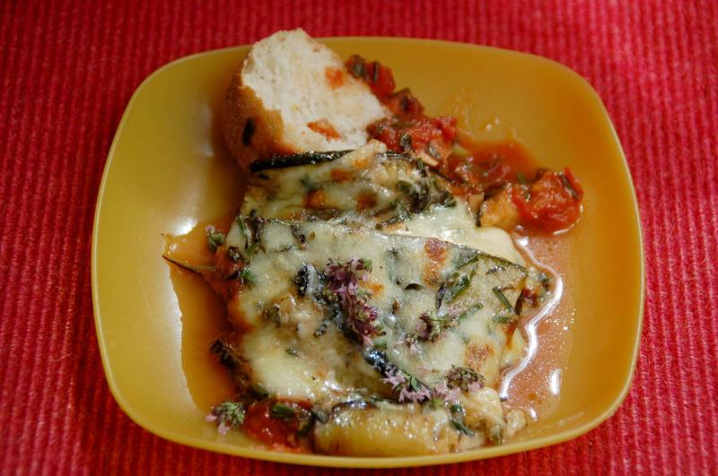 Überbackene Zucchinischeiben (Zucchini, stückige Tomaten, Knoblauch, Mozarella, Parmesan, Oregano, Schnittlauch, S&P, Zucker), dazu rustikales Baguette