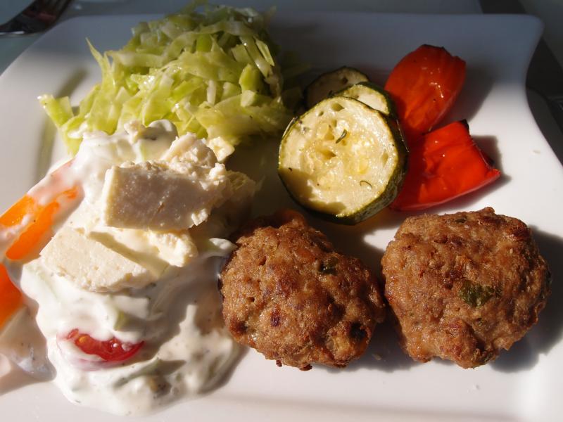 gestern fleischküchle mit tzatziki, spitzkrautsalat, zucchini, paprika und ciabatta