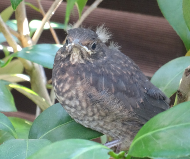 Die jungen Amseln haben das Nest verlassen. Eine sitzt in meinen Kamelien und wartet ruhig auf die Mama.