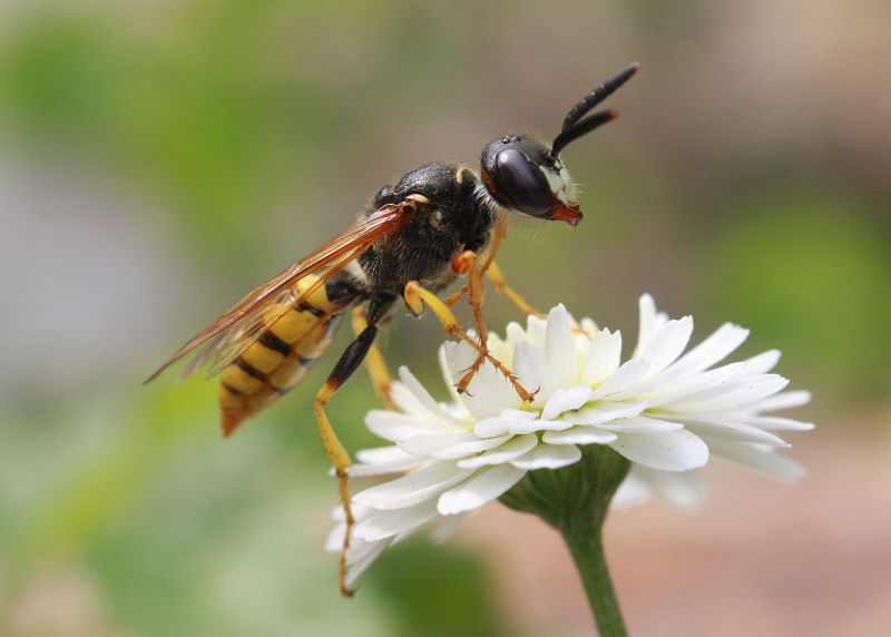 Ein Bienenwolf war nicht mehr ganz einsatzfähig, aber noch gut bildtauglich.Hangelte sich zu Fuß und kläglich flatternd von Blüte zu Blüte.