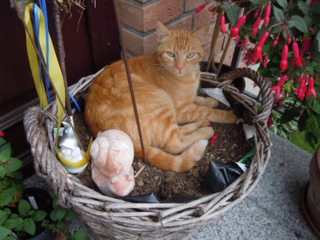 gestern hat er das Puzzle von GG bewacht ..... heute unsere HaustürEigentlich war der Korb für Blumen gedacht ....