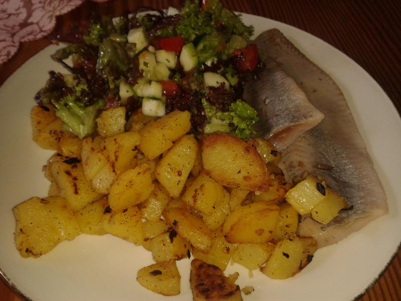 Gestern gab es Ofenkartöffelchen (kleines Gelumpe aus dem Garten), Wildbratwurst und Tomaten-Mozarellasalat.