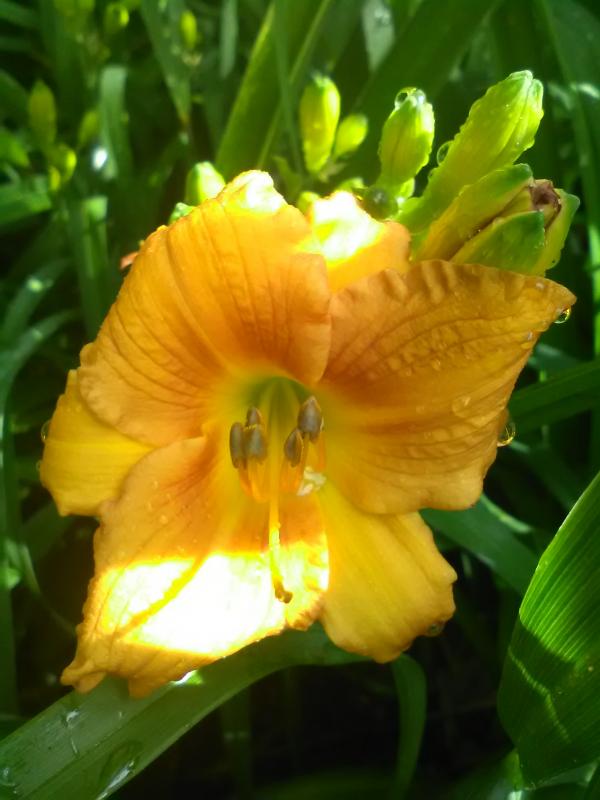 Hier Copper Cabana (Early Fragrance x Sandra Elizabeth) - praktisch, wenn man Rebloom-Blüten zum Kreuzen mit den ganz späten verwenden kann. Höhe 90 cm, Blütendurchmesser 18 cm, Blütezeit spät bis sehr spät, duftend (dank der Mama); farblich schwer zu beschreiben - ein leuchtendes Kupferbraun-Orange mit leichtem Auge/Band. Der Sämling tendiert zu gelben Farbeinsprengungen/geflammten Blütenblättern - eine Kreuzung mit den konstant geflammten Sorten hier ist geplant, um diese Musterung ans Saisonende zu transferieren (passende Pollen sind eingefroren). Ich kreuze allerdings nur mit Pflanzen, die ab 1. August hier noch blühen.