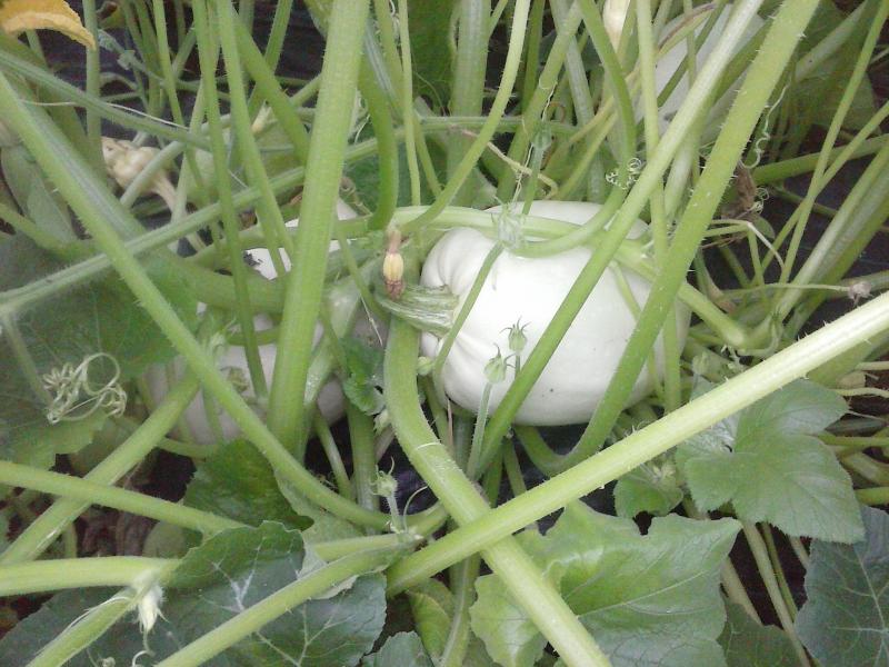 Oben "JWS 6823", angeblich einer der ersten mehltaufesten Butternuts. Viele eher kleine Früchte. Bis jetzt in der Tat kein Mehltau. Reift auch früh, könnte was für schwierige Lagen sein. Ein paar Andere sind auch fast so weit, z.B. "Indian Doll":