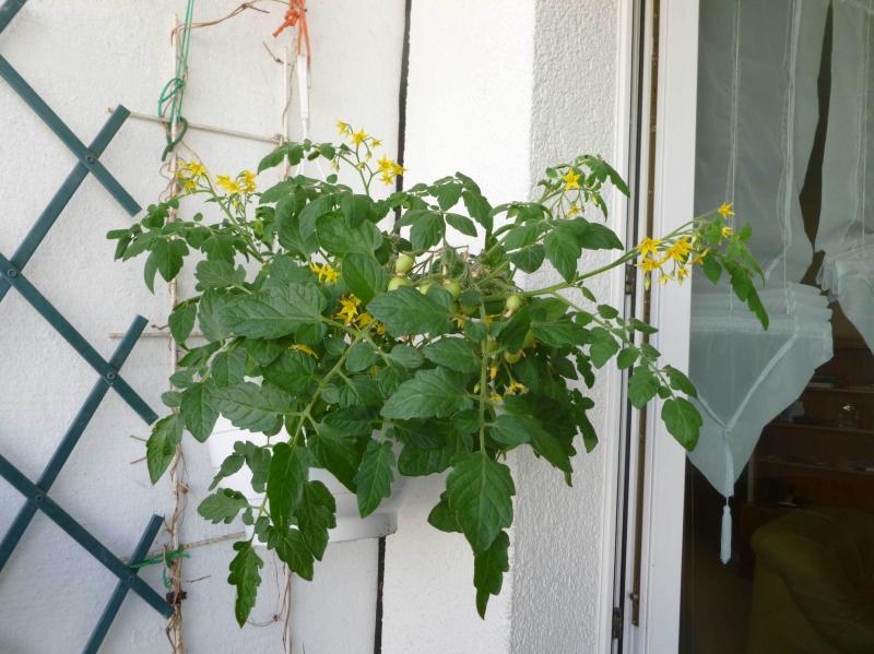 Meine liebste (vom Geschmack, Aufwand und Ernte) Naschtomate auf dem Balkon ist die Gartenperle. Sie hängt in einem 3 Liter-Fallfohrtopf mit 0,5 l Wasserspeicher.Hier zur Blüte:Ich sehe gerade, dass es hier eine 4 Liter Ampel ist.