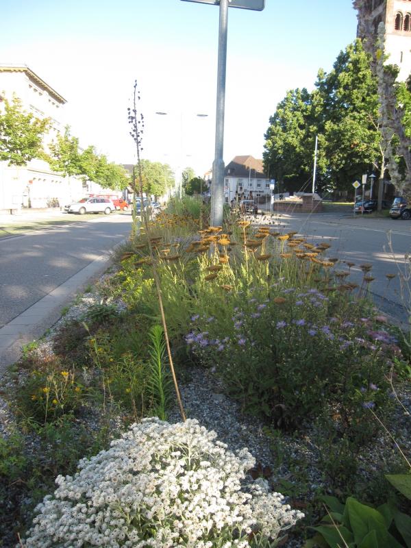 Ein Kontrastprogramm zu oben gezeigtem Mittelstreifen - und eigentlich nicht sonderlich ausgefallen - ist die Bepflanzung einer Grünanlage am Stadtbahnhof in Ettlingen.Als ich die Fotos gemacht habe, war gerade ein Mitarbeiter der Stadt mit dem Schlauch zugange und hat gegossen.