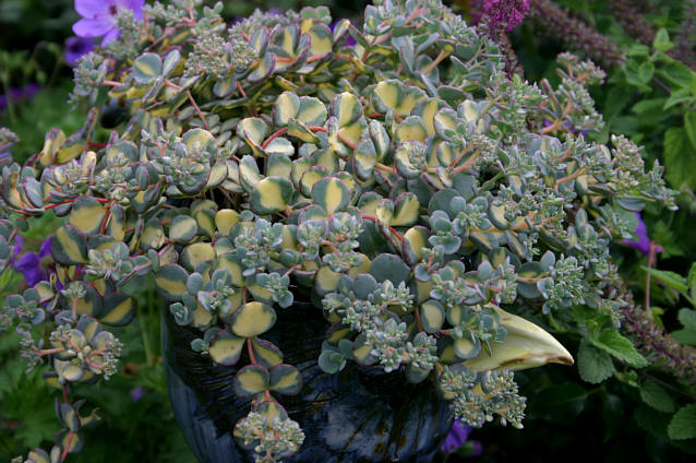 In der Mitte werden die Perlkörbchen komplett entfernt. Links steht Sedum Carl, das möchte ich dort nicht wegnehmen. Noch eine andere Sedumart daneben würde mir nicht gefallen.Seht ihr den kleinen Plattenweg der zum Kellerabgang führt? Dort steht hinter dem Perlkörbchen 3x Sedum Matrona.Es gibt eigentlich nur 2 Möglichkeiten Rozanne (habe ich bereits im Garten) oder die Stachys (sind auch schon vorhanden). Ich probiere es glaube ich erst einmal mit Stachys und wenn das nicht gefällt mit Rozanne.Nana hat schon recht, ein größeres Blatt würde mir auch gut gefallen. Muss aber auch zu den sonnenhungrigen Gaura, etc. passen.