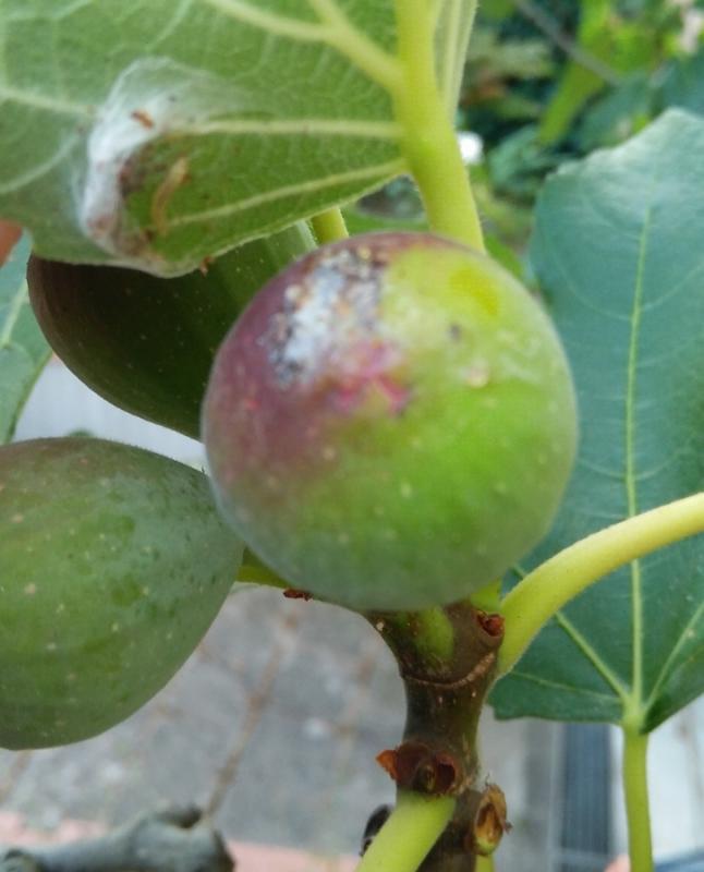 die befallene Pflanze hatte ich frisch gekauft, sie hatte Transportstress, wurde von mir umgetopft, und leider hat sie die einzige Sommerfeige, eine helle Sorte wie Dalmatie, nach den kalten Tagen, abgeworfen. Sie macht aber neue...:)