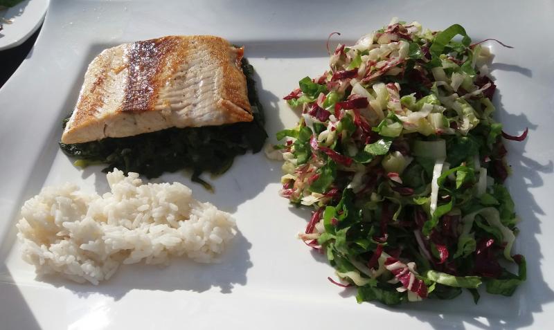 Heute gab es gebratenen Lachs mit Reis, Neuseeländer Spinat und Reis, dazu Endivien mit Raddicchio.